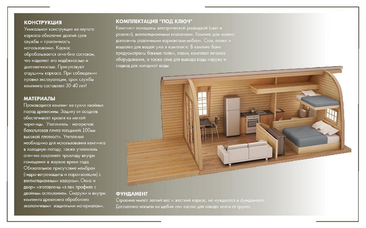 Мебель: Кровать складная односпальная 2 шт. (или двухспальная 1 шт.), стол стационарный, раковина, смеситель, полка для вещей стационарная, вешалка.