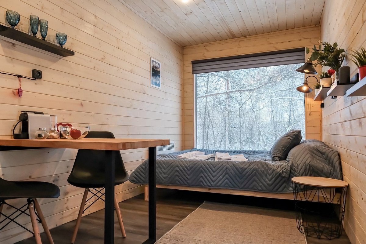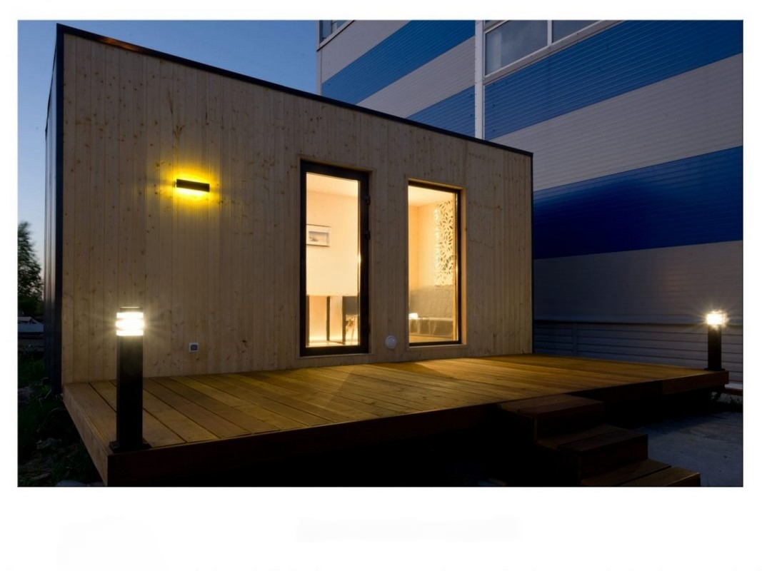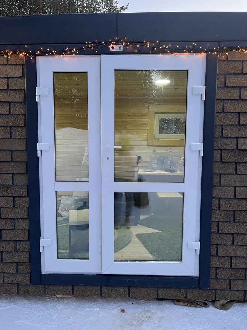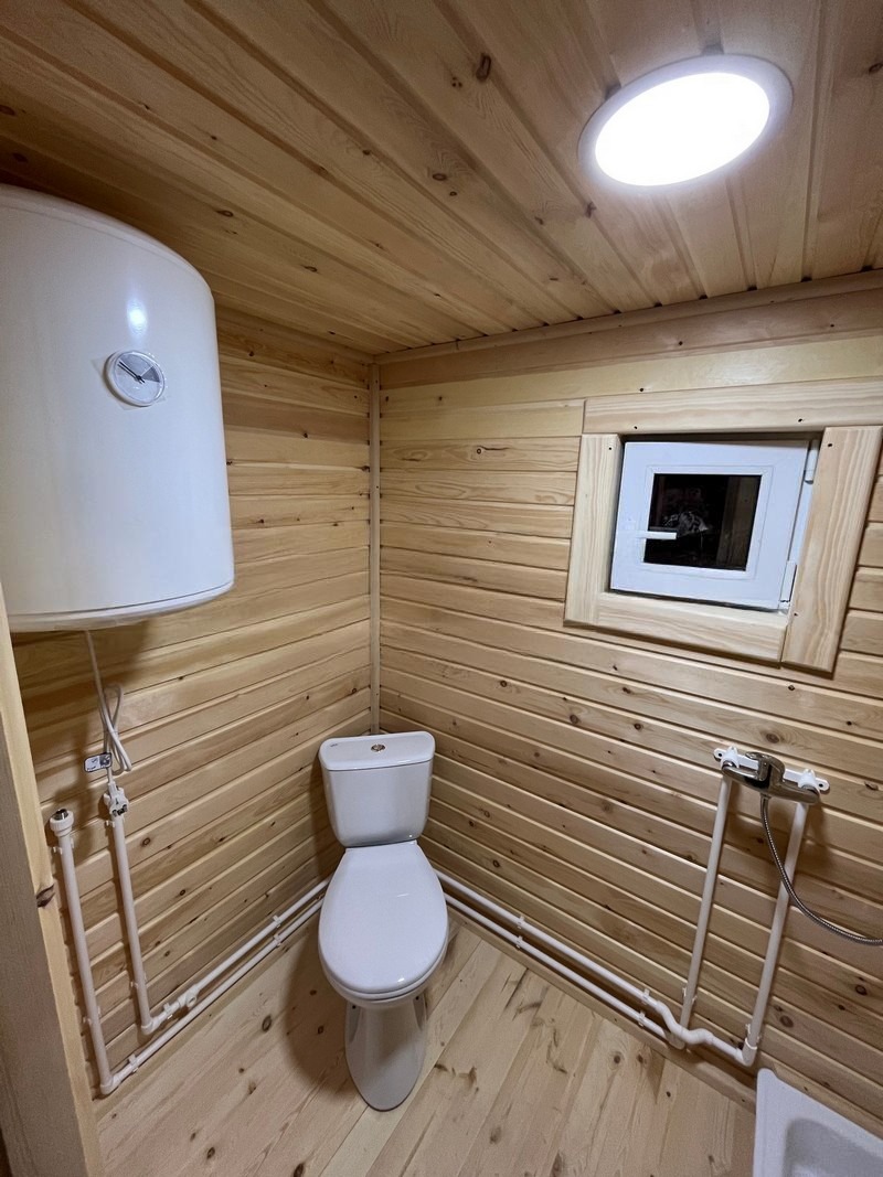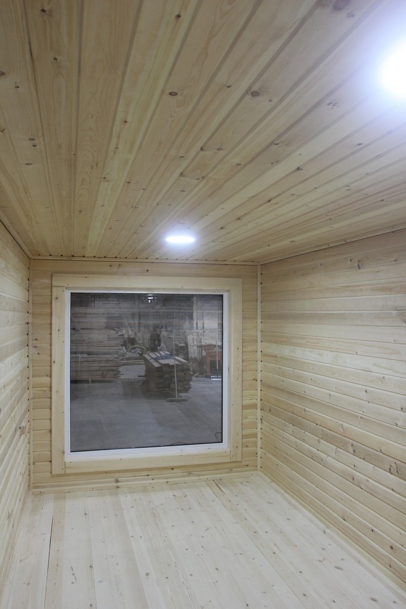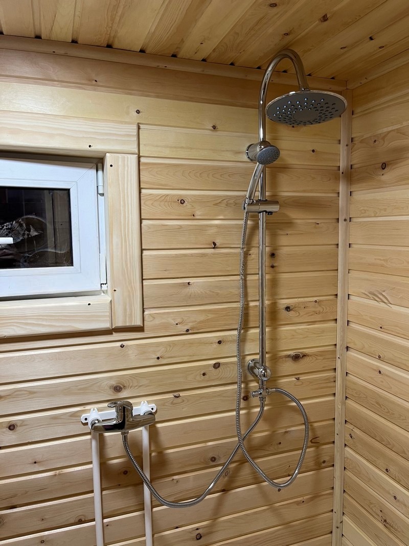 Несущий каркас из кедра Экологически чистая минеральная теплоизоляция URSA М25 Внутренняя отделка: кедровая вагонка Наружная отделка: виниловый сайдинг под брус Окно панорамное глухое 1 шт Окно открывное 1 шт Душевой поддон, смеситель, душевая лейка Санузел (унитаз, бойлер) Электропроводка и светильники